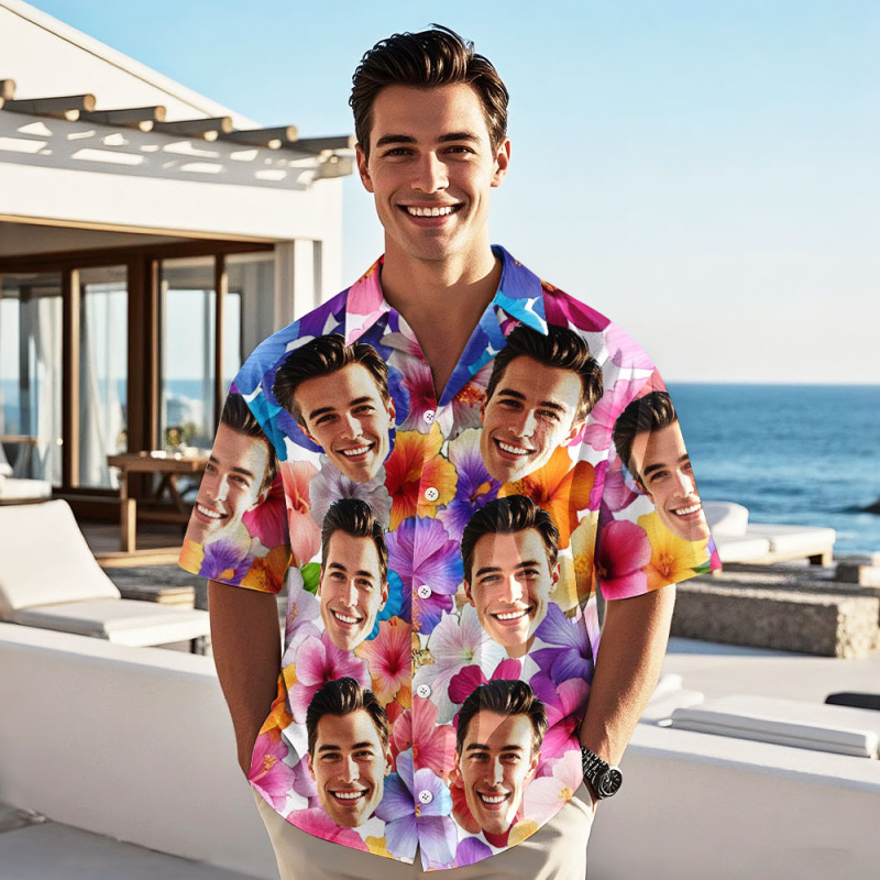 Custom Face Hawaiian Shirt Summer Colorful Flowers Aloha Shirt Vacation for Men