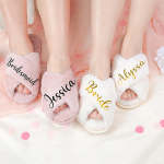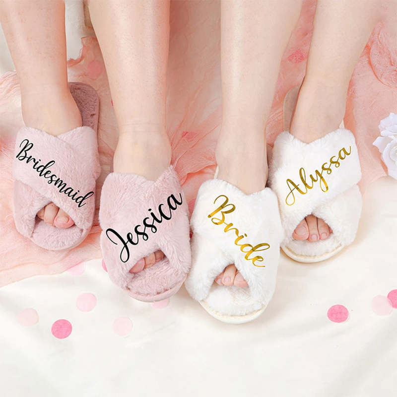 These custom fluffy slippers are the perfect gift for a bride or bridesmaid. Each pair features a fluffy cross design and can be personalized for a unique touch. Give the gift of comfort and style with these custom slippers.