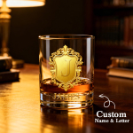 Custom Gold Badge: Features a striking, three-dimensional gold badge design that can be customized with initials and names