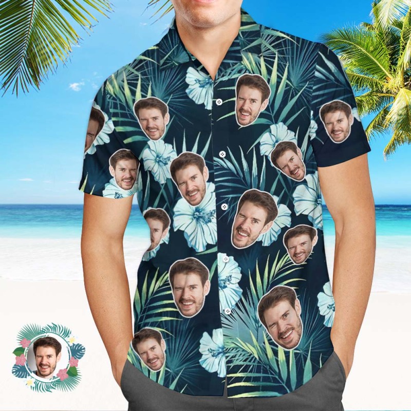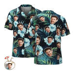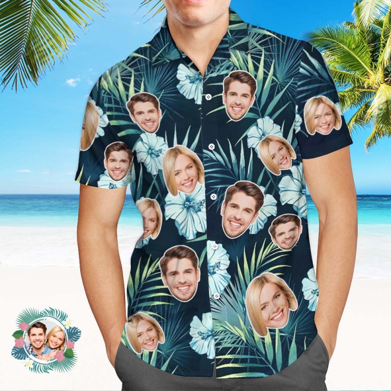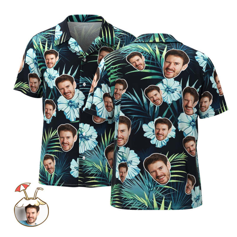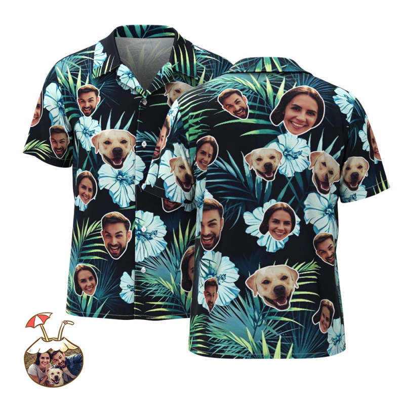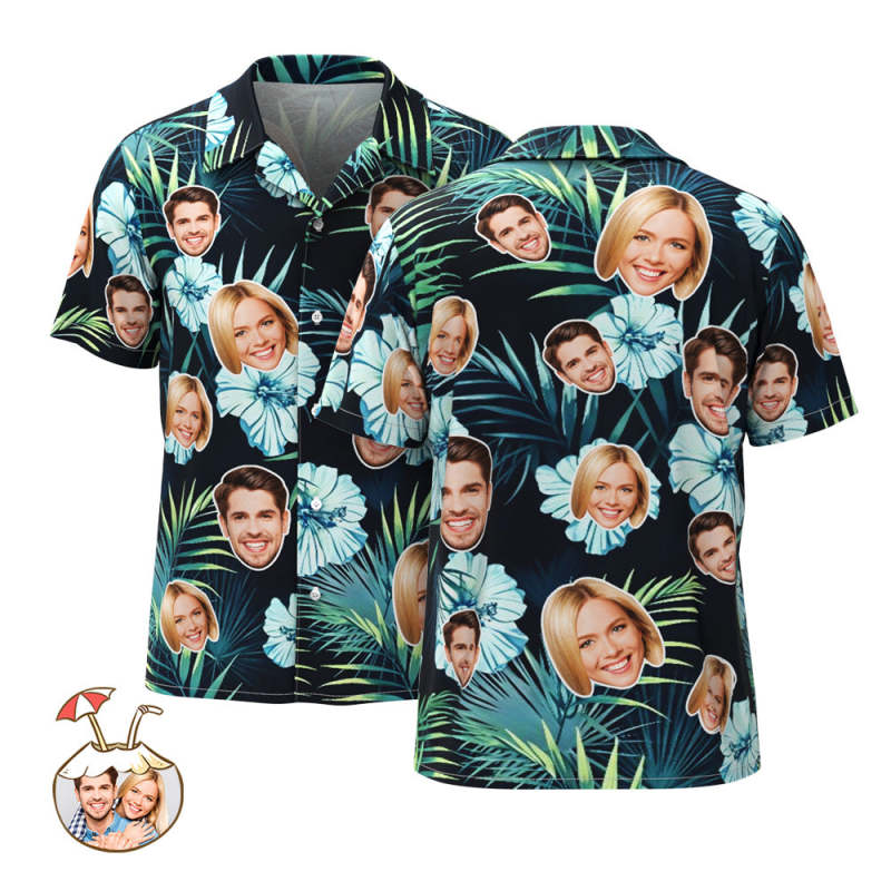 Custom Hawaiian Shirt With Up to 3 Faces Flowers and Leaves Dark Blue