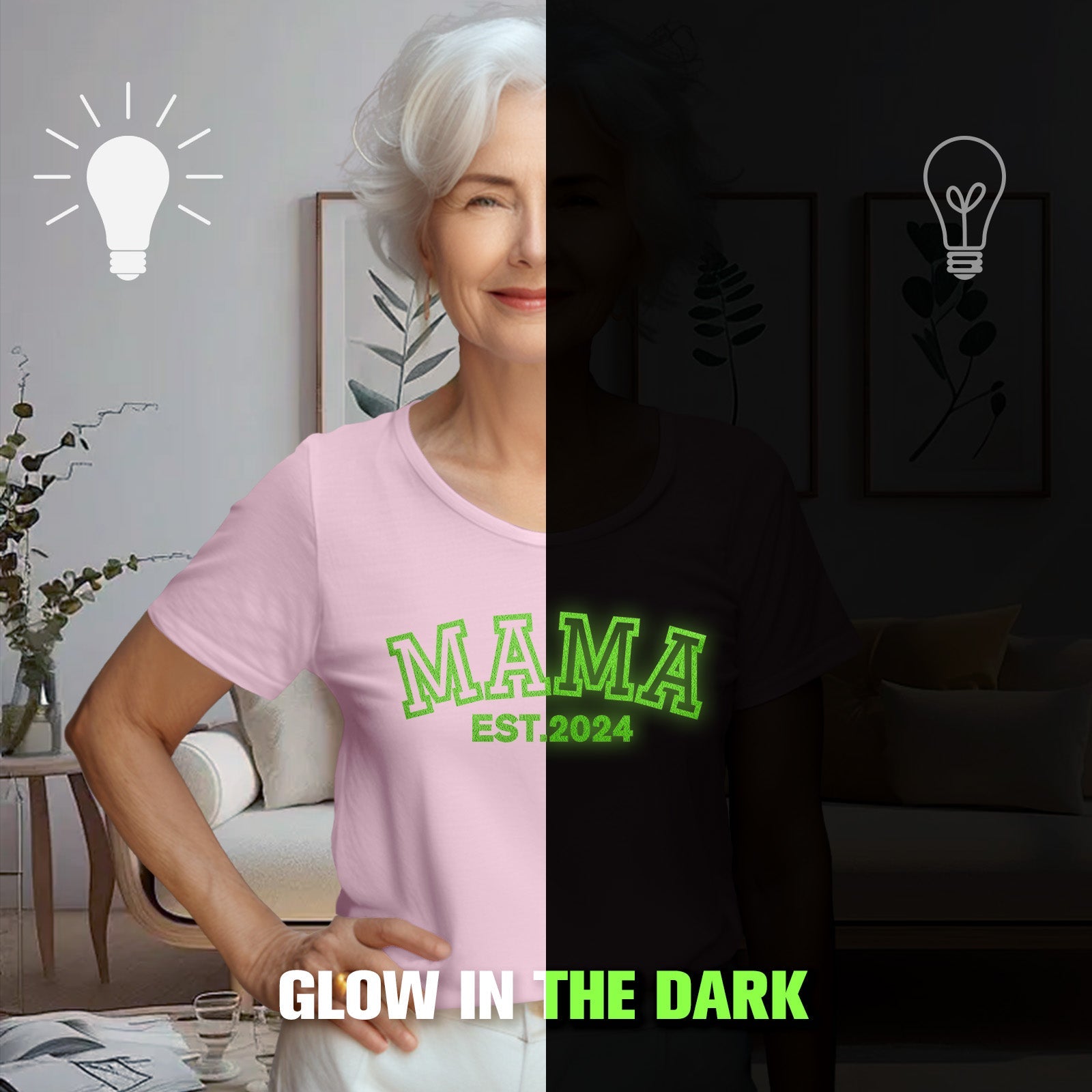 - Celebrate Mom in a unique and glowing way with our Custom Mama Glow-in-the-dark T-shirt, the perfect Mother's Day gift that combines style and sentimentality. Crafted with care, this T-shirt features a special glow-in-the-dark design that adds a magical touch to Mom's wardrobe.
