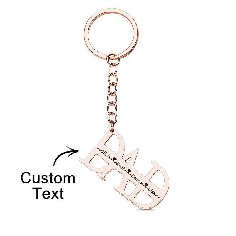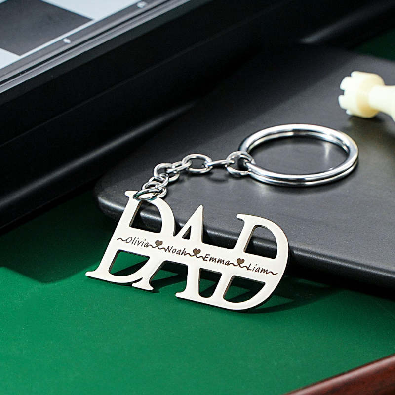This personalized Dad keychain is the perfect gift for Father's Day or birthday. Engrave up to 4 names on the keychain, making it a unique and thoughtful present. Show your appreciation for Dad with this custom keychain.