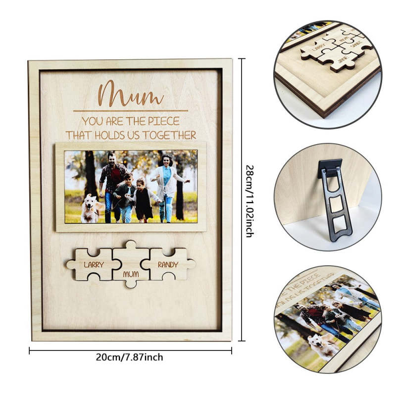 Personalized picture frames for home decor can be customized with your family's picture and family member's name up to 6 names. And proudly proclaim "You Are The Piece That Holds Us Together" to mum.