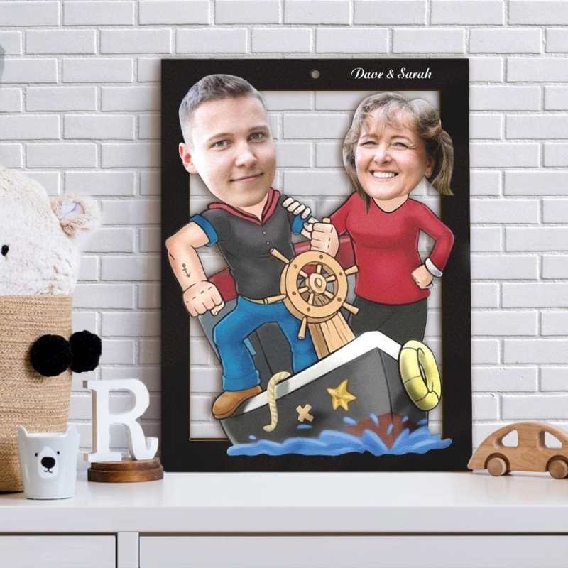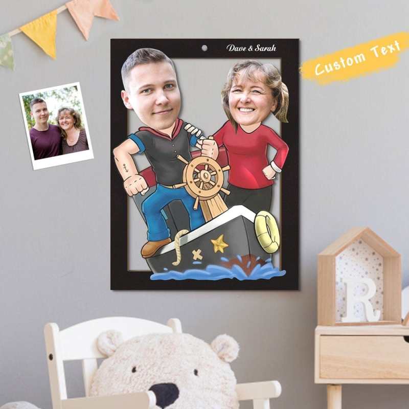 Custom Face Photo Wooden Frame Personalized Cartoon Sail Mommy and Boy Wooden Wall Art Decoration Gifts
