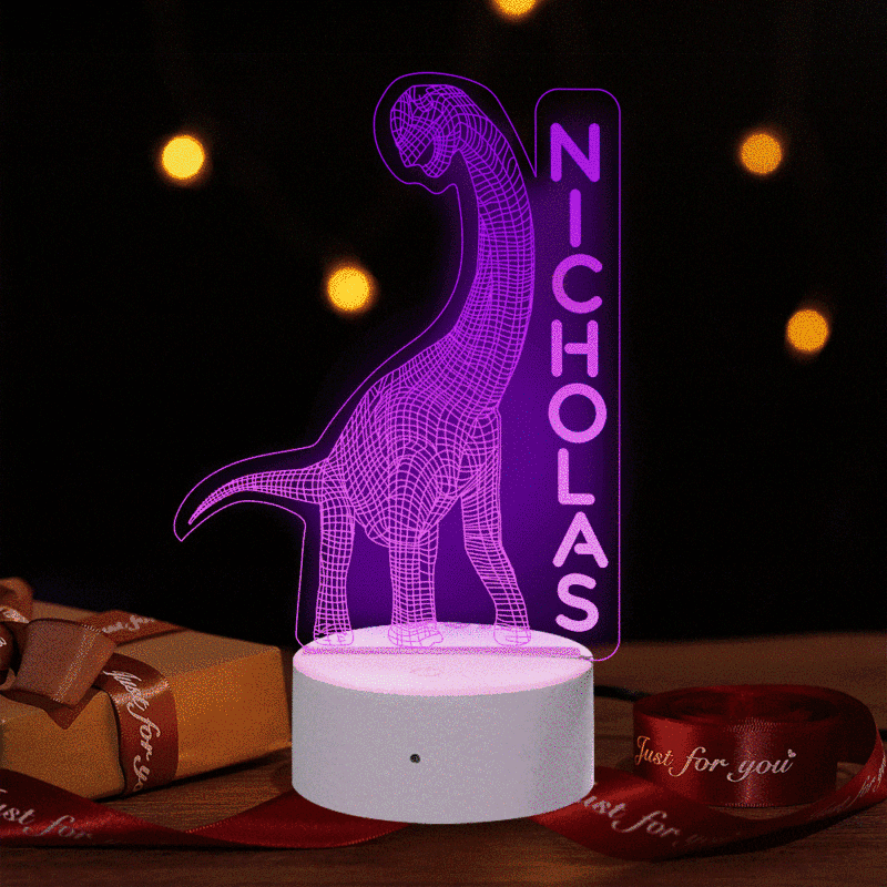 Each light is personalized and laser-etched on our specialized high-grade optical acrylic to including your name along with one of our many unique designs such as an adorable T-Rex Dinosaur, Tyrannosaurus, Triceratops, and Diplodocus
