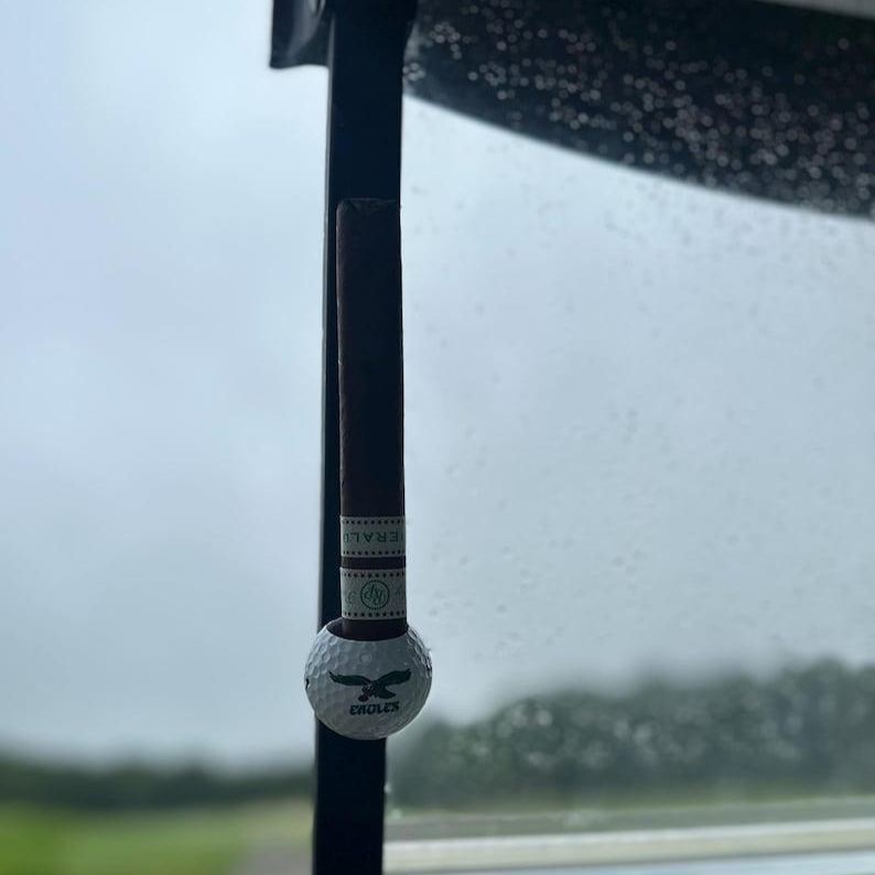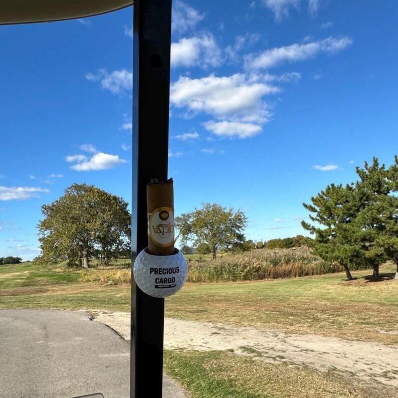 This magnetic cigar holder is a must-have for any cigar lover. It features a unique design that combines both style and functionality. The holder is made from high-quality materials and features strong magnets that securely hold your cigar in place. Each holder has a pin inside to ensure the cigar will not move. The cigar holder sticks to any metal surface and can be used outside of the golf course as well!