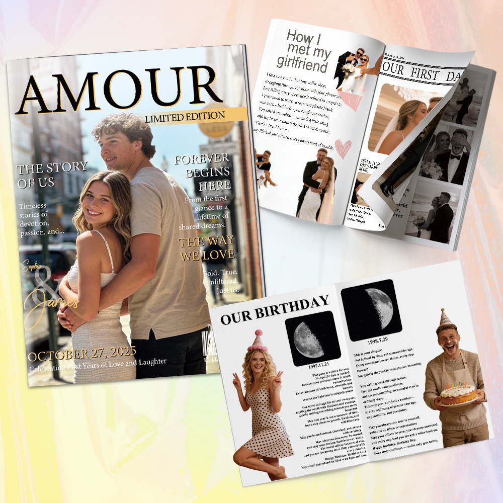 Pour your love into Personalized Couple Magazine - a unique keepsake designed to celebrate your love story in the most creative way. Each page is crafted with your photos, names, meaningful dates, and sweet moments, transforming them into a stylish magazine-style layout that feels both fun and heart-warming.