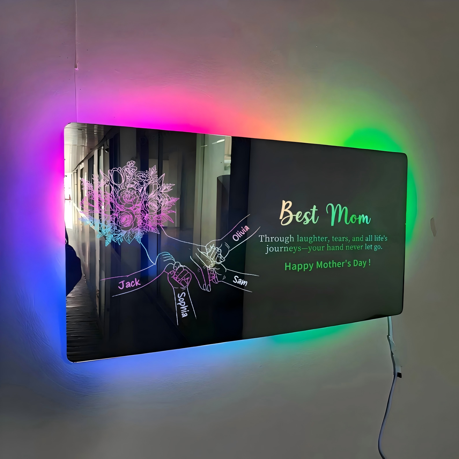 Celebrate the love of family with this personalized LED mirror light, featuring a touching hand-in-hand design customized with names. This unique wall décor doubles as a soft ambient light, creating a warm and meaningful atmosphere in any room. Available in two styles, customers can choose their favorite design to suit their sentiment. The glowing LED backlight enhances the engraved artwork, making it a perfect gift for Mother’s Day, birthdays, or special occasions. Thoughtful, elegant, and customizable, it’s a heartfelt way to show appreciation for Mom while adding a stylish decorative touch to the home.