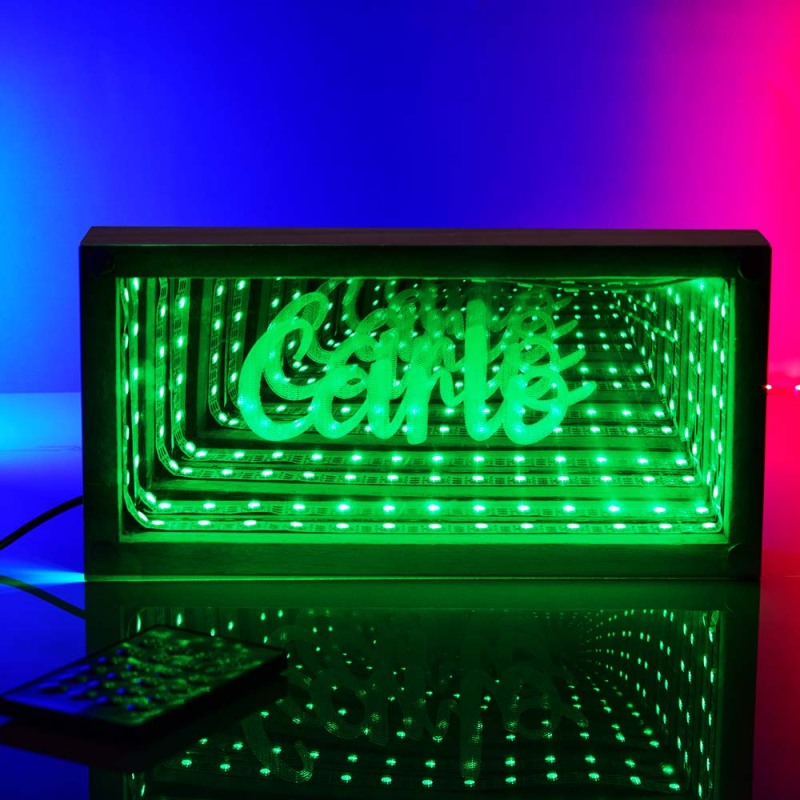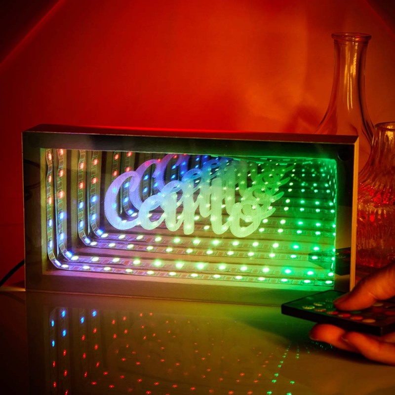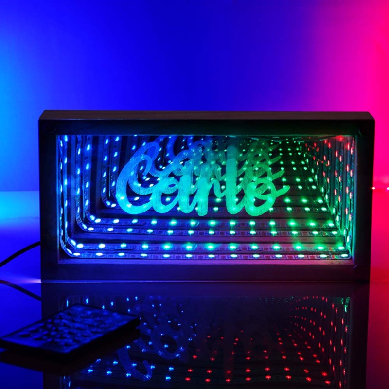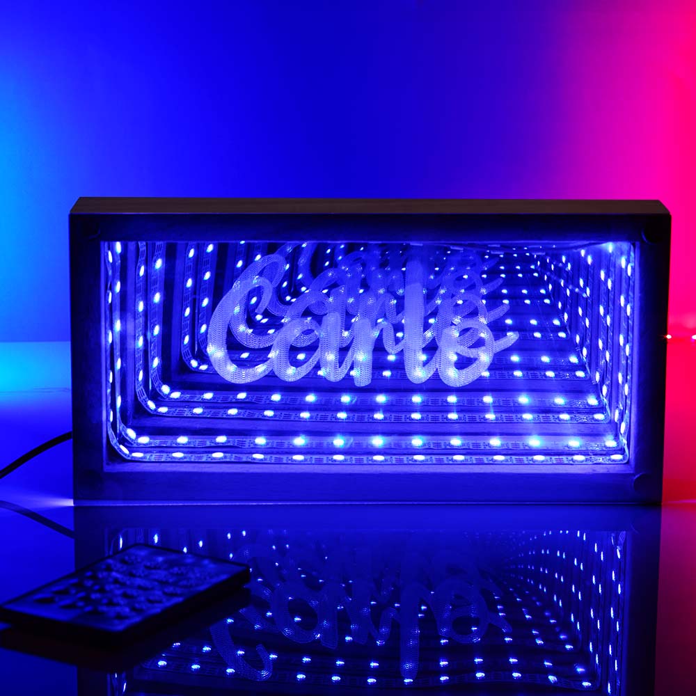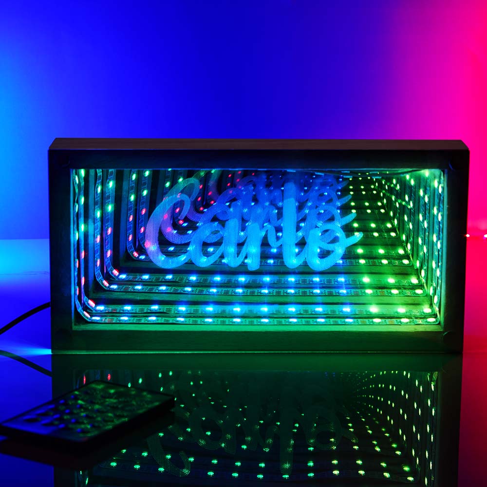 This unique personalized LED mirror display features addressable LED lights that create a captivating infinity effect that will enhance your decor. This fascinating piece is handcrafted and consists of a lightweight wooden frame and a high quality acrylic mirror.