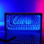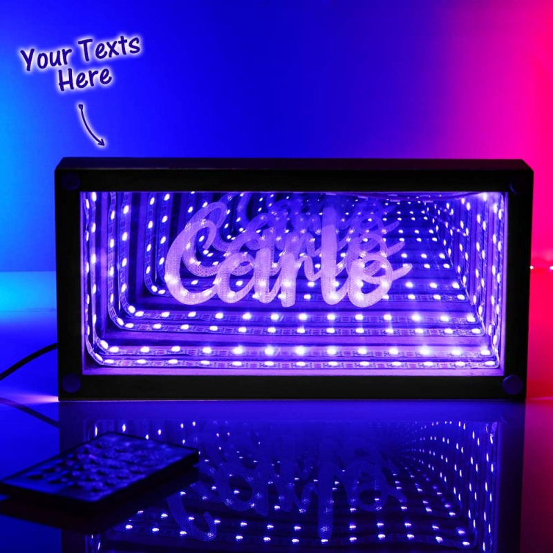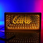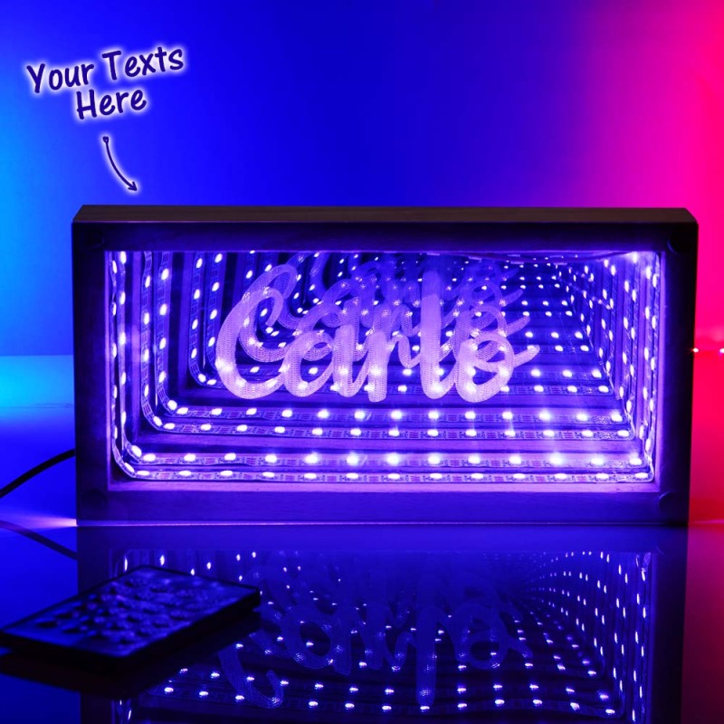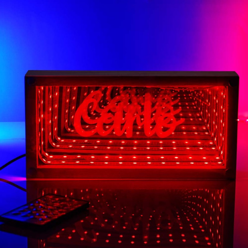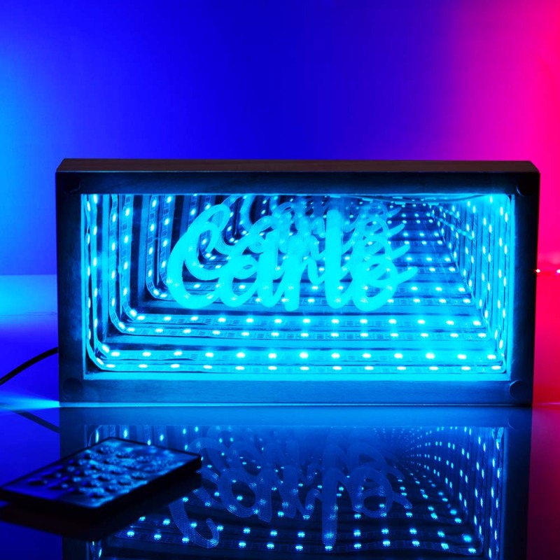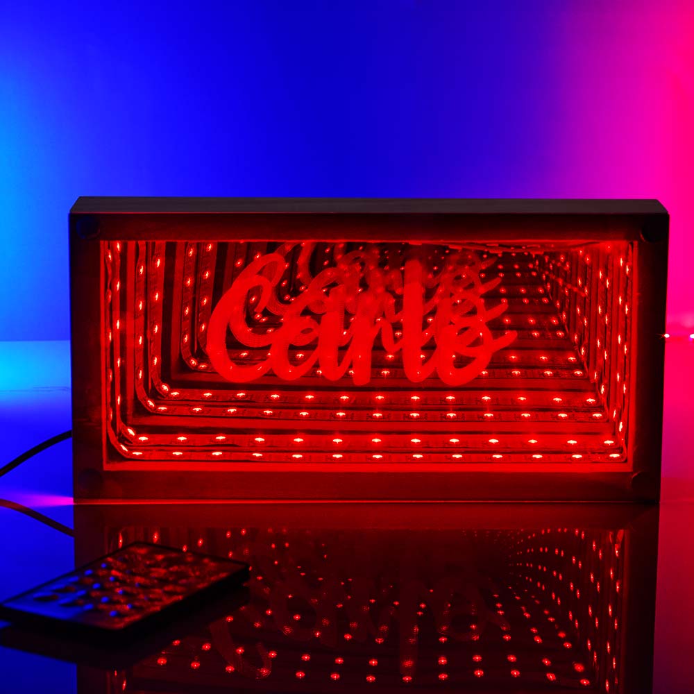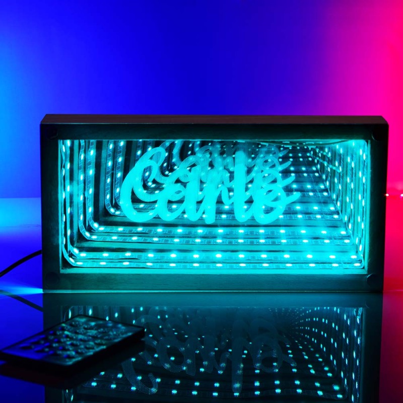 This unique personalized LED mirror display features addressable LED lights that create a captivating infinity effect that will enhance your decor. This fascinating piece is handcrafted and consists of a lightweight wooden frame and a high quality acrylic mirror.