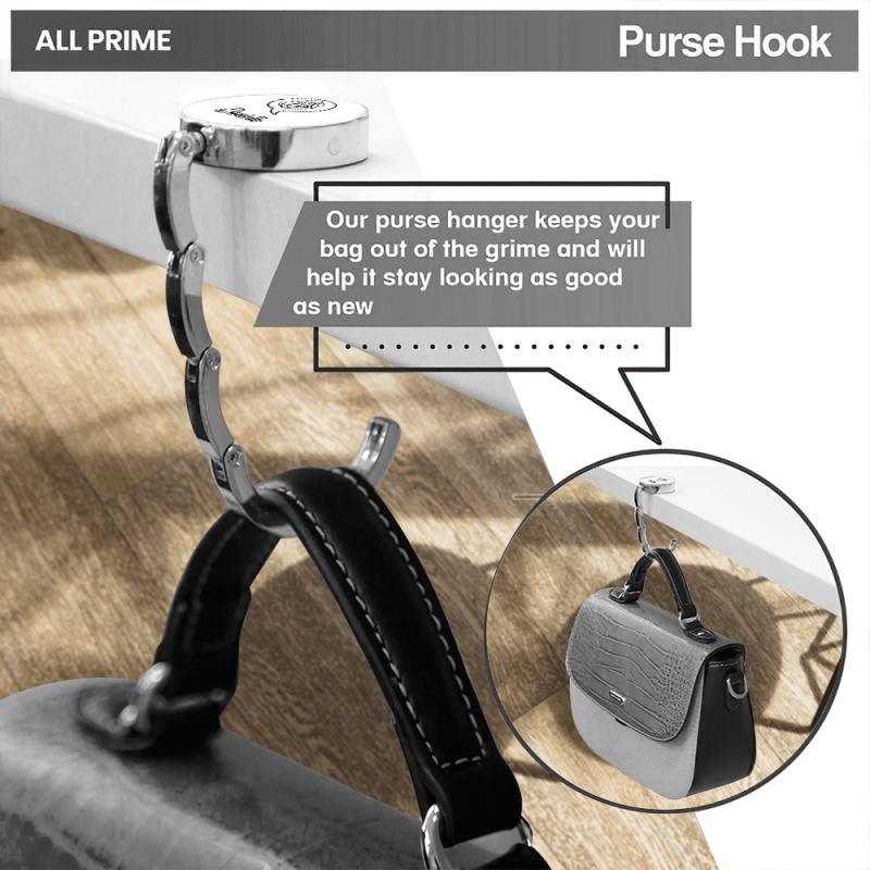 Has a rubber non-slip backing and unfolds to hang your purse on a table edge.