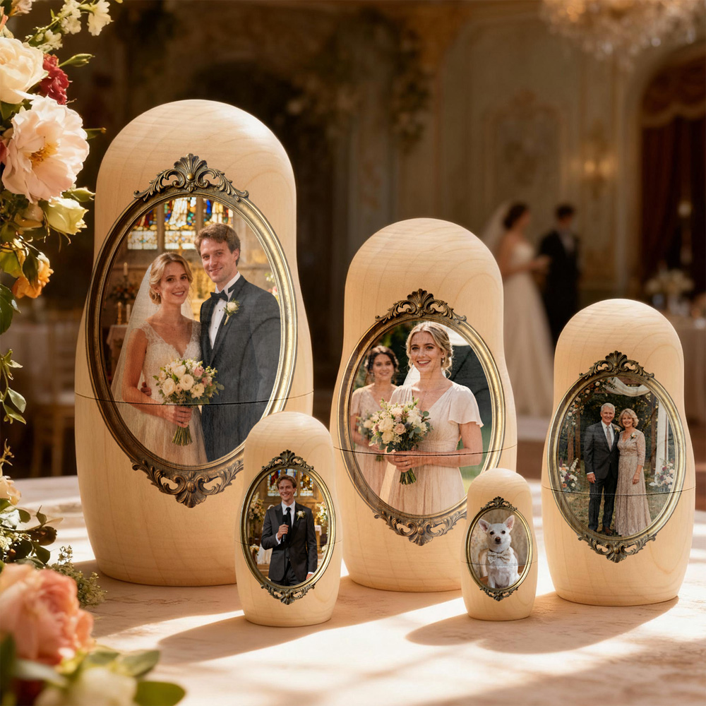 Whether it’s a portrait of your family, a couple’s photo, or a cherished moment with friends, these nesting dolls bring warmth and personality to any space. Made from high-quality wood and polished by hand, they blend traditional craftsmanship with your personal story.