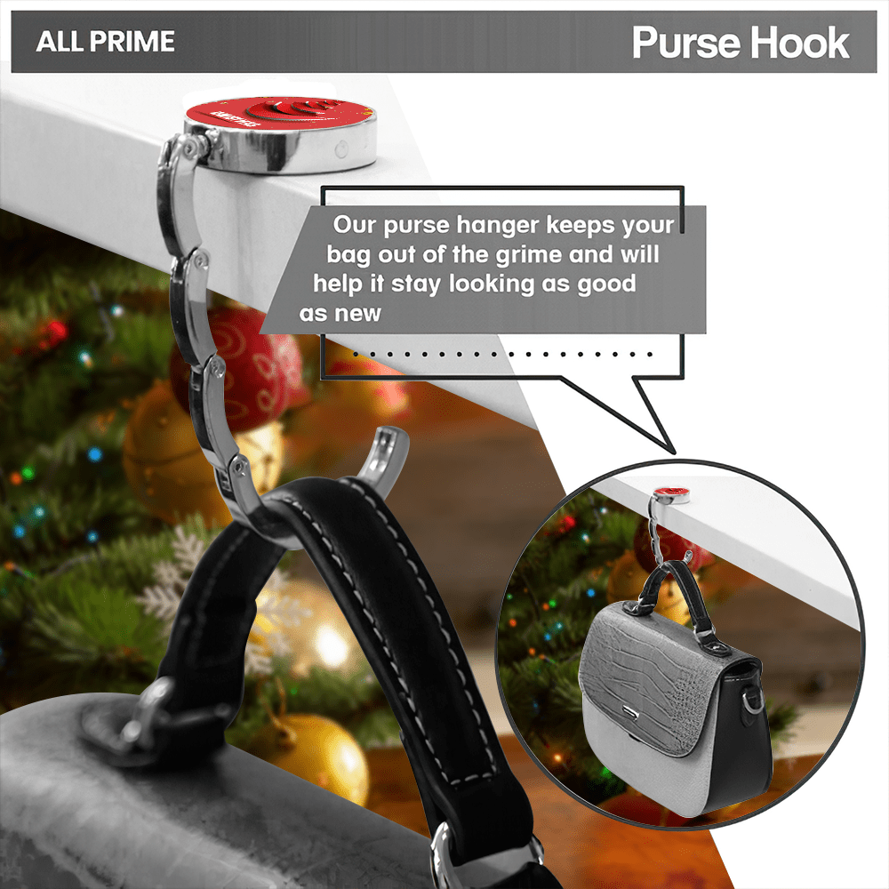 Has a rubber non-slip backing and unfolds to hang your purse on a table edge.