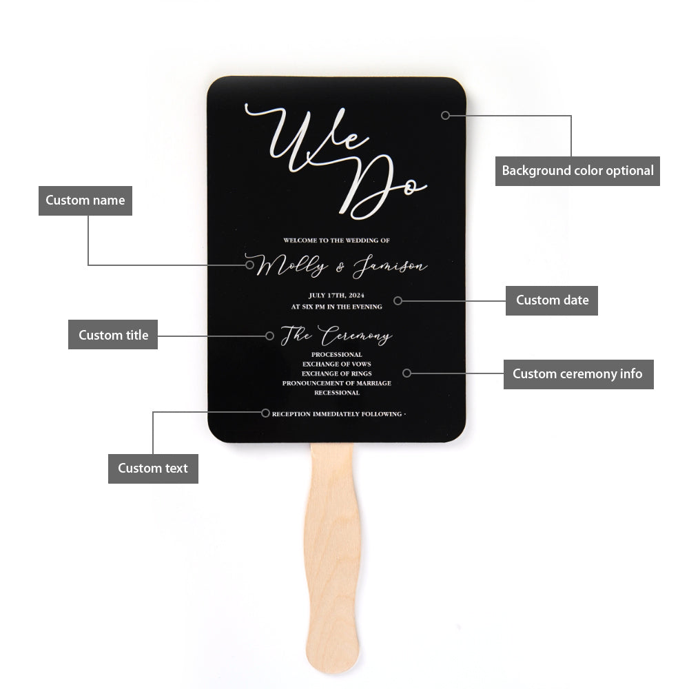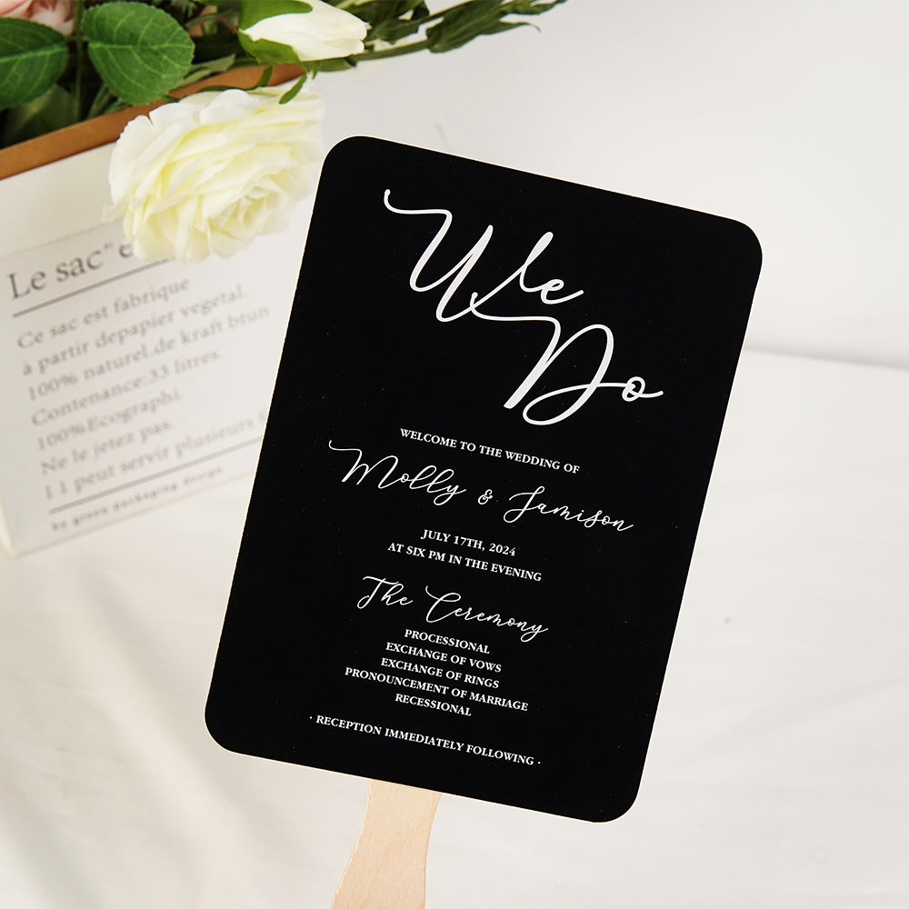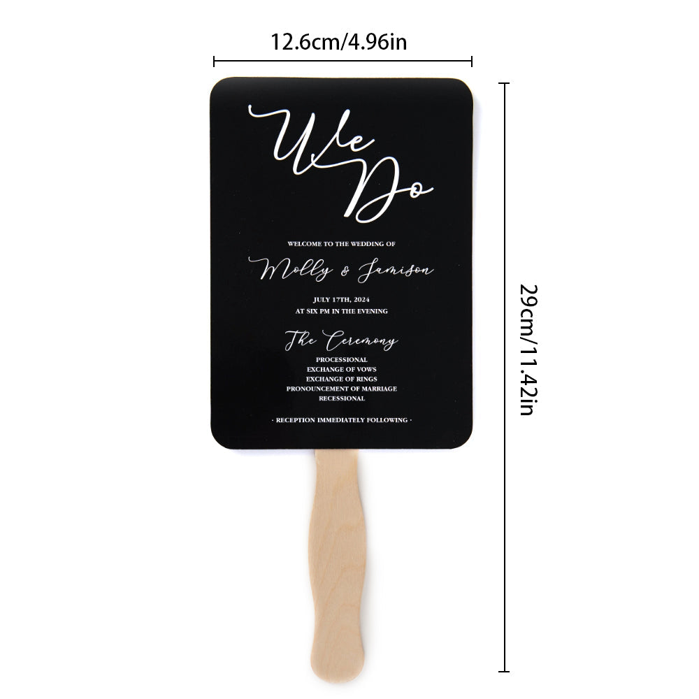 Introducing our Personalized Wedding Program Fans Gift for Weddings! Add a unique touch to your special day with our personalized wedding program fans. Featuring customizable details, these fans are not only a classy addition to your wedding but also keep your guests cool during the ceremony. Create a memorable experience for your guests with our personalized fans.
